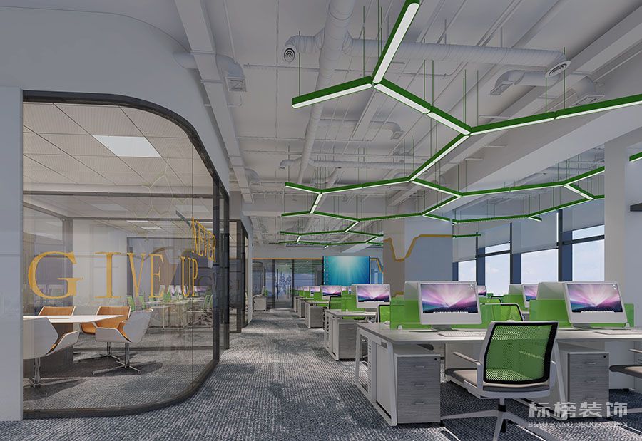 設計效果圖,辦公室設計麵積1000平方,設計師在辦公室設計中,以開放、自由、簡潔為辦公室設計關鍵詞,